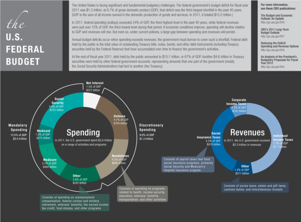 Below is an infographic summarizing the history of the US Federal Budget, by the Congressional Budget Office (CBO) /http://www.cbo.gov/publication/42636). It shows the budget over time and as a percentage of GDP, and in the context of total spending and revenue. This was used to emphasise that the federal government's budget deficit for 2011 was the third-largest in the past 40 years: